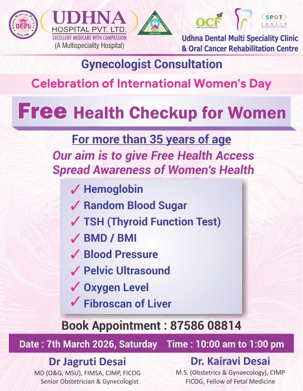 Free checkup with PAP tests was done for 103 women by Dr Jagruti Desai, Dr Kairavi Desai, Dr Rajeshri Dani assisted by Udhna Hospital staff members on Wednesday, 4th February 2026 at Udhna Hospital Pvt Ltd.