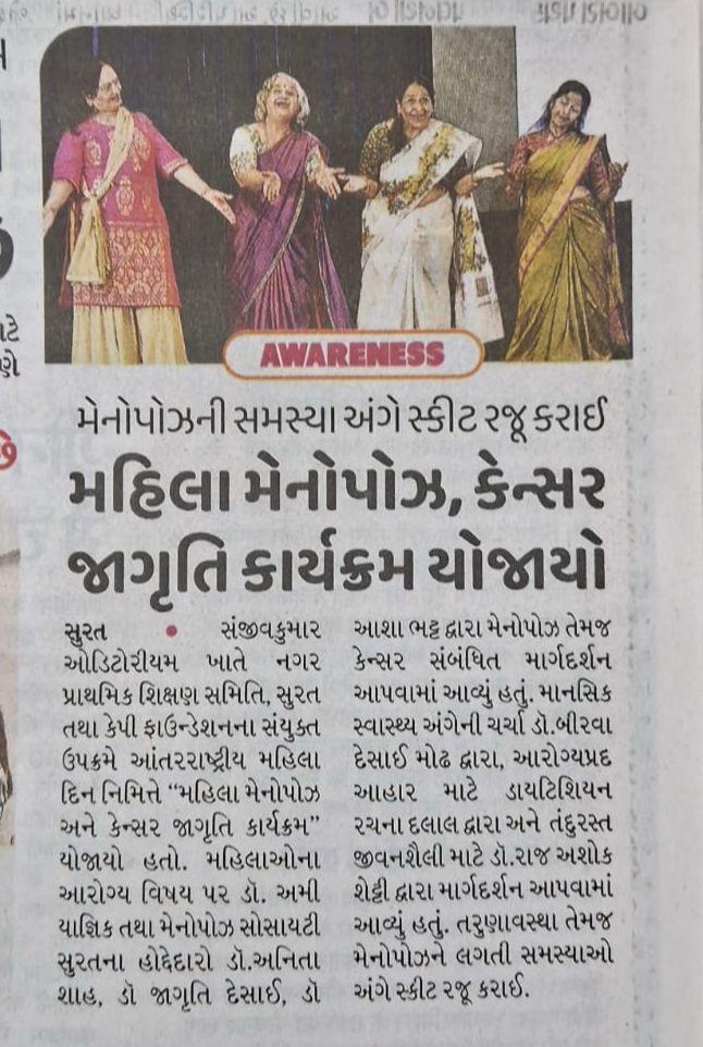 Honoured and previleged to share that I delivered a lecture on “Cancer in women” on 17 th March 2026 at Sanjeevkumar Auditorium,Surat to 1000 plus women(majority)and men on behalf of Menopause Society Surat. Also performed a live skit on the topic of Menopause.