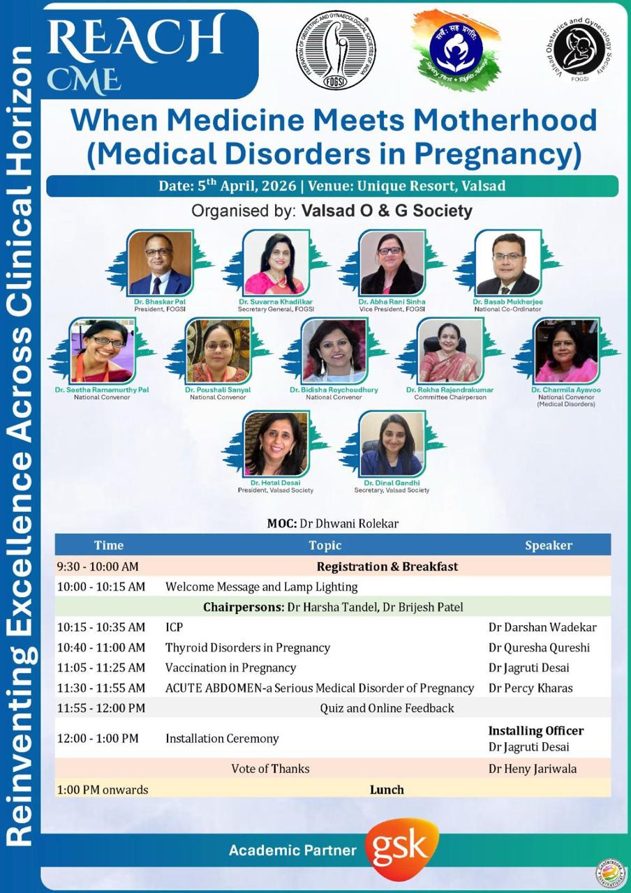 Invited to FOGSI “REACH CME “ When Medicine Meets Motherhood (Medical Disorders in Pregnancy)Organised by Valsad O & G Society on Sunday,5th April 2026.